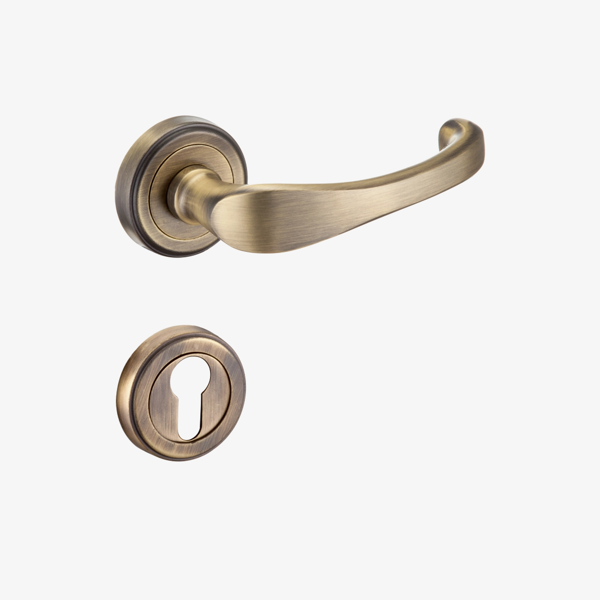 Organic form of a bow like shape forming the grip of lever, culminating elegance in a oval form like a water droplet;